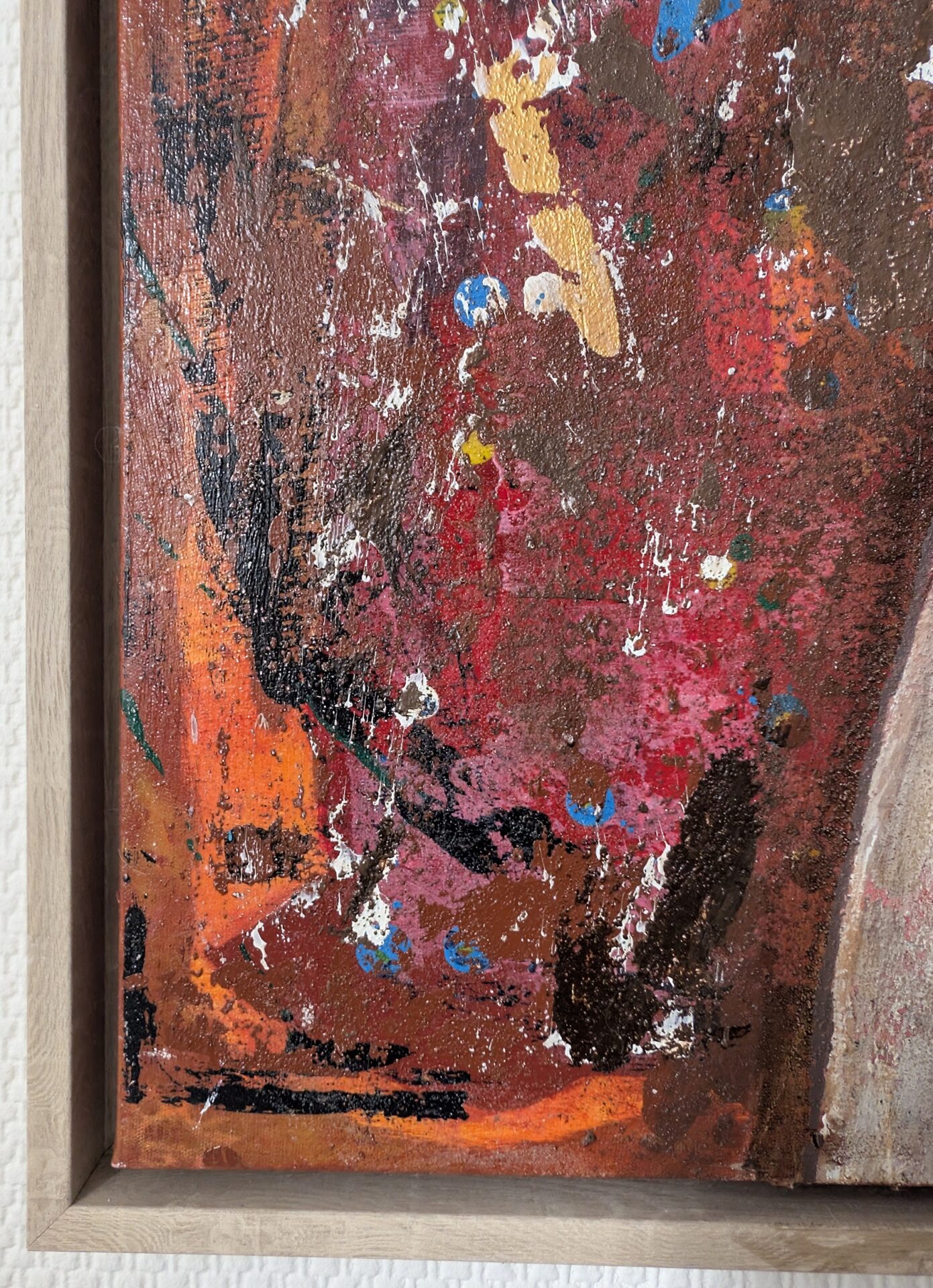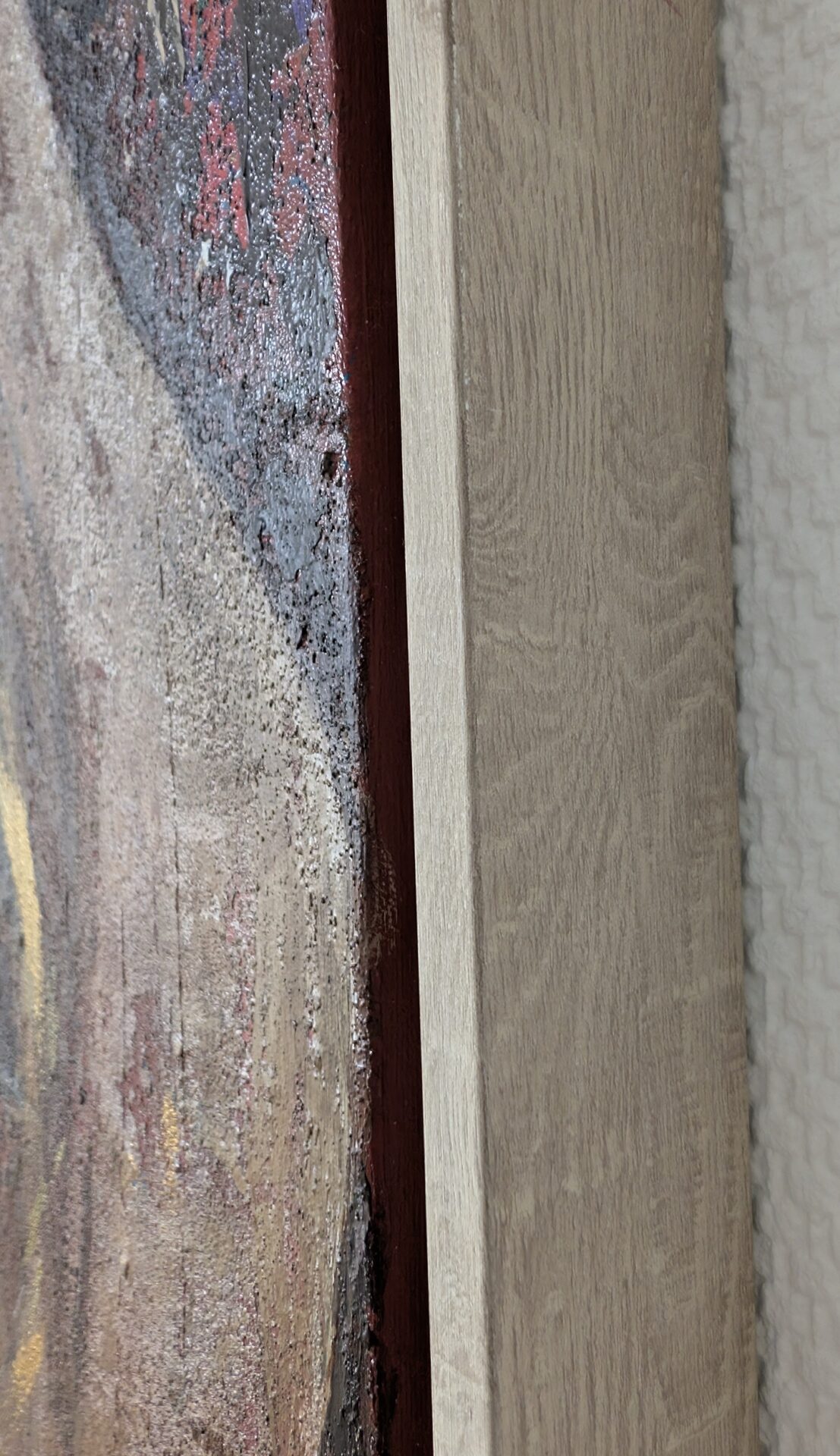 Das Werk ist auf einem Schattenfugenrahmen montiert, der dem Bild eine schwebende Präsenz an der Wand verleiht.